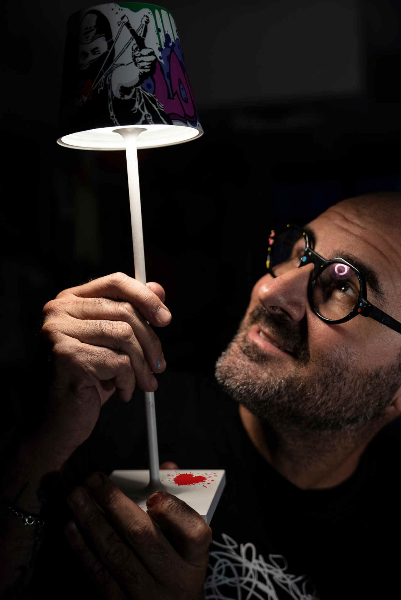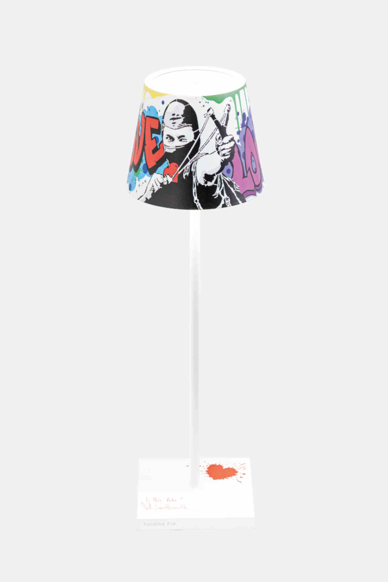 A table lamp as an art object: the limited edition of the Poldina lamp features Vandalo Appassionato – an iconic figure by artist Mr. Savethewall. With a heart symbol and signature on the lamp base, Italian design meets urban romance. Only 299 pieces worldwide – ideal for signature rooms, art bars, or hotel projects with collector's value.