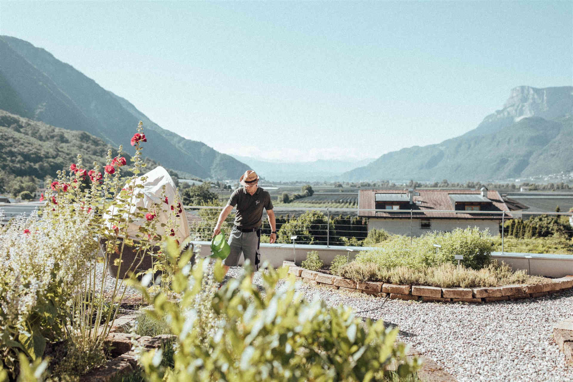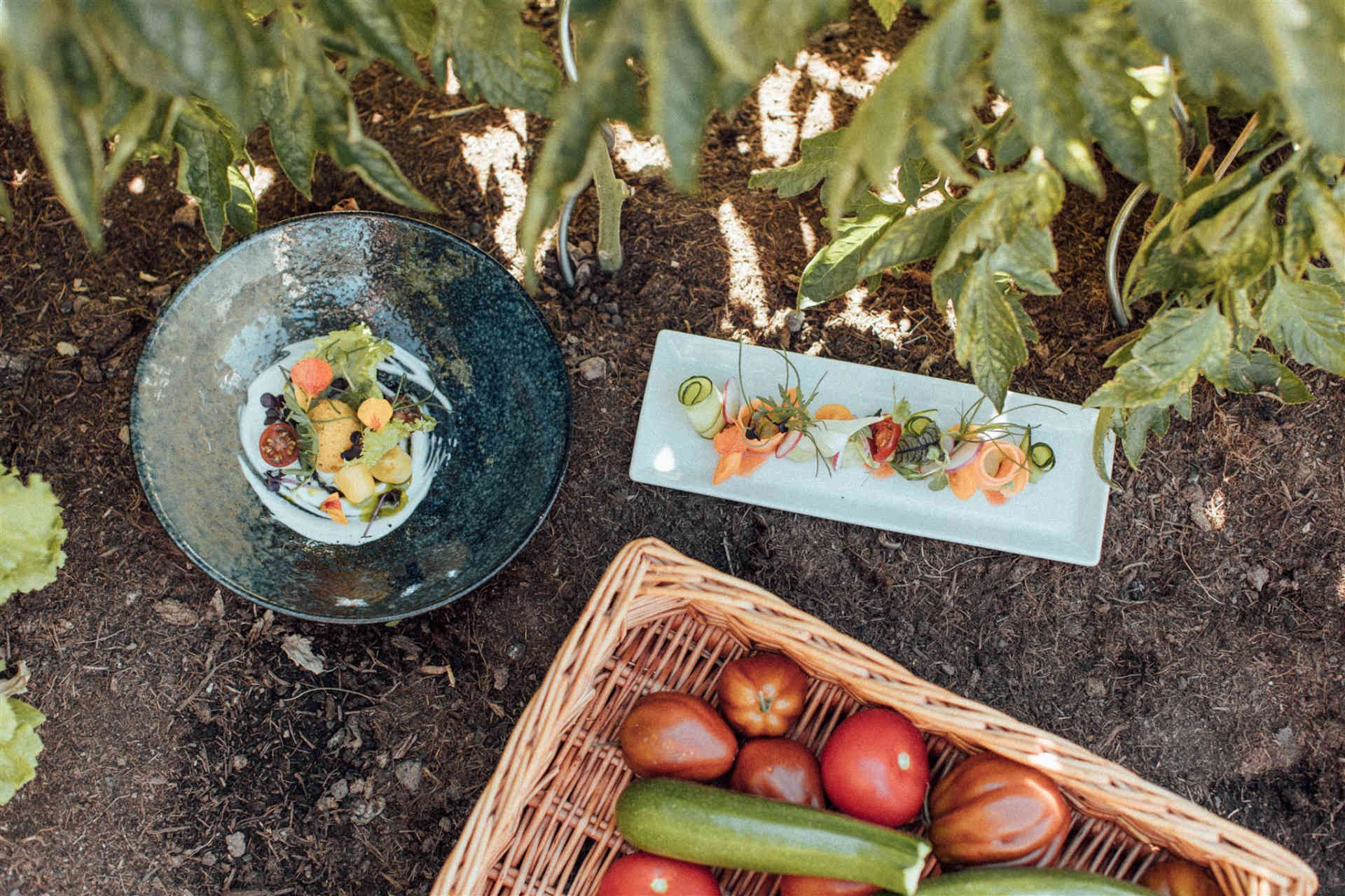 Our farm not only produces apples, but also pears, apricots, plums, peaches, nectarines, table grapes, persimmons, quinces, and even Indian bananas—each fruit is a highlight in its own season. Our herb and vegetable garden on the hotel terrace is a special experience, where guests can watch the chefs harvesting.